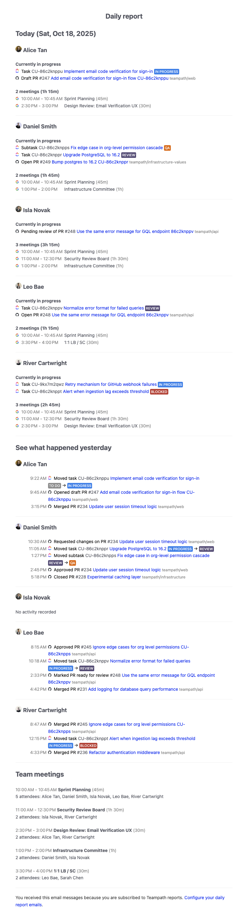 Your daily report surfaces stale PRs, stuck tasks, and meeting overload automatically. Stop discovering problems during performance reviews. Catch them early and offer help when it matters.
